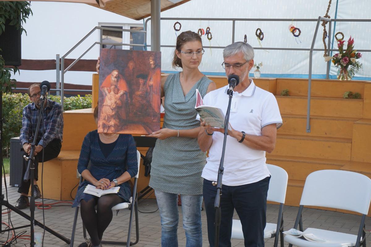 Leben weben mit Naturmaterialien zeigte Bettina Albrecht. Jedes Leben ist bunt und vielfältig. Lässt es sich auch als Kunstwerk darstellen? Bettina Albrecht lud Besucherinnen ein, eine Blume, ein Gras, ein Stück Natur in einen Rahmen einzuweben und dies symbolisch für einen Aspekt ihres Lebens zu tun. Noch Tage später stand der Webrahmen im Kirchengarten und wurde immer wieder besucht und bewundert.