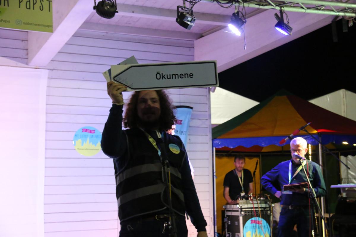 „Mit Luther zum Papst“ ist in Rom mit dem Ökumenepreis der Arbeitsgemeinschaft Christlicher Kirchen (ACK) in Deutschland ausgezeichnet worden. Der Vorsitzende der ACK, Erzpriester Radu Constantin Miron überreichte den Organisatoren den mit 2500 Euro dotierten Preis im Quartier der Pilger auf dem Zeltplatz bei Ostia. In der Begründung heißt es, so der Vorsitzende der ACK, die Intiative komme „niedrigschwellig auch mit Konfessionslosen und Ungetauften ins Gespräch über den Glauben“ – das stärke die Kirchen in ihrer Diaspora-Situation in Mitteldeutschland.