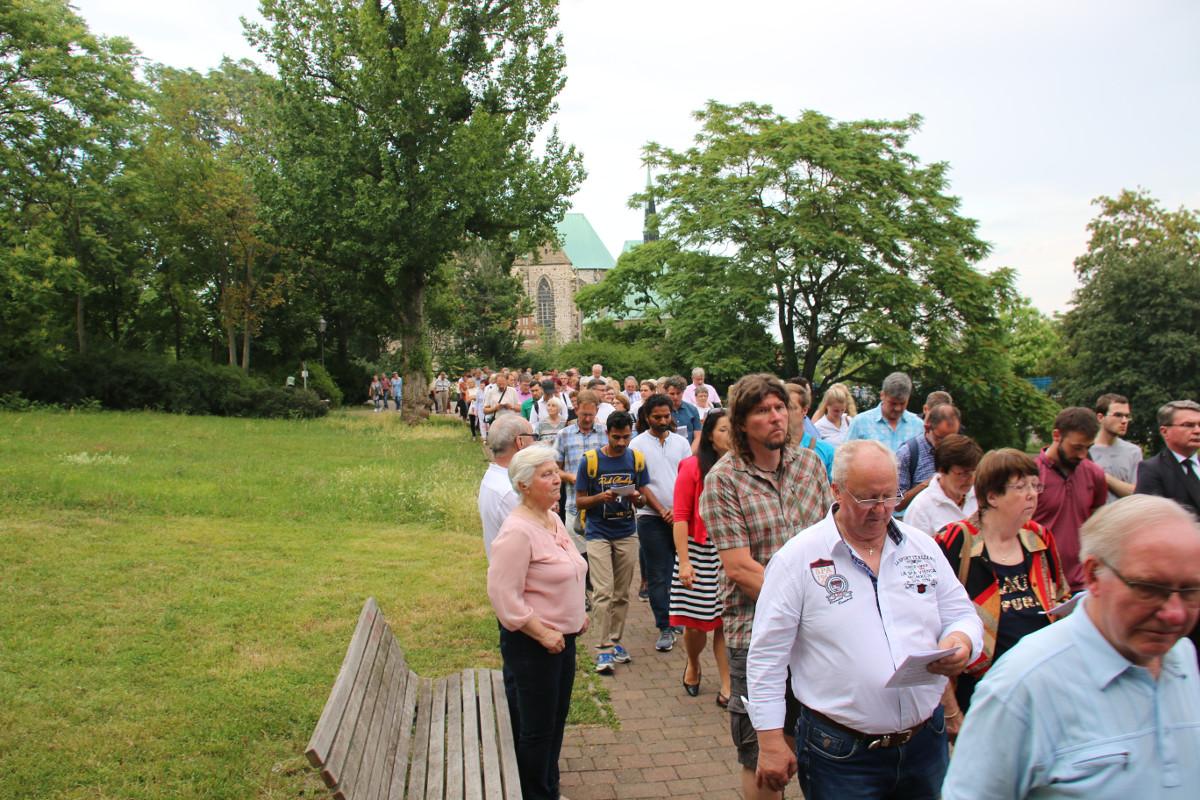 An diesem heißen Tag begrüßte Bischof Dr. Gerhard Feige die Gottesdienstbesucher mit der frohen Botschaft: „Der Auferstandene ist mit uns auf dem Weg“, an jedem Tag trotz Kummer oder Sorgen und der großen Herausforderungen, die jeder einzelne zu bewältigen habe. „An Fronleichnam“, so der Bischof, „feiern wir das Geheimnis der Eucharistie im Glorienschein.“